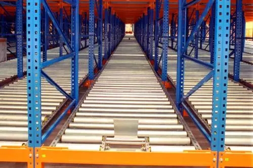 的每一個貨格就是一個具有一定坡度的存貨滑道。入庫起重機裝入滑道的貨物單元能夠在自重作用下,自動地從入庫端向出庫端移動,直至滑道的出庫端或者碰上已有的貨物單元停住為止。位于滑道出庫端的第一個貨物單元被出庫起重機取走之后,在它后面的各個貨物單元便在重力作用下依次向出庫端移動一個貨位。